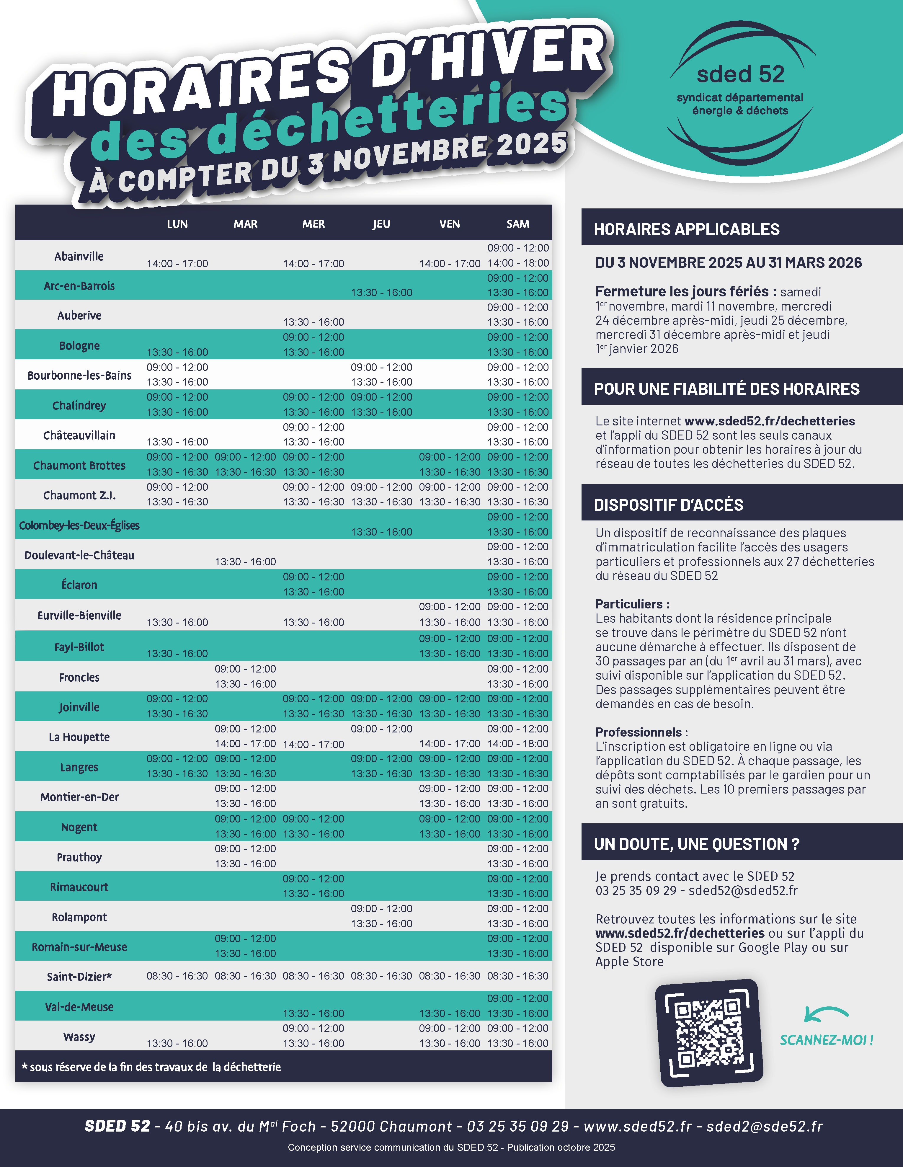 Le SDED 52 vous informe du passage aux horaires d’hiver de tout le réseau des déchetteries à compter du lundi 3 novembre 2025 et jusqu'au 31 mars 2026 :