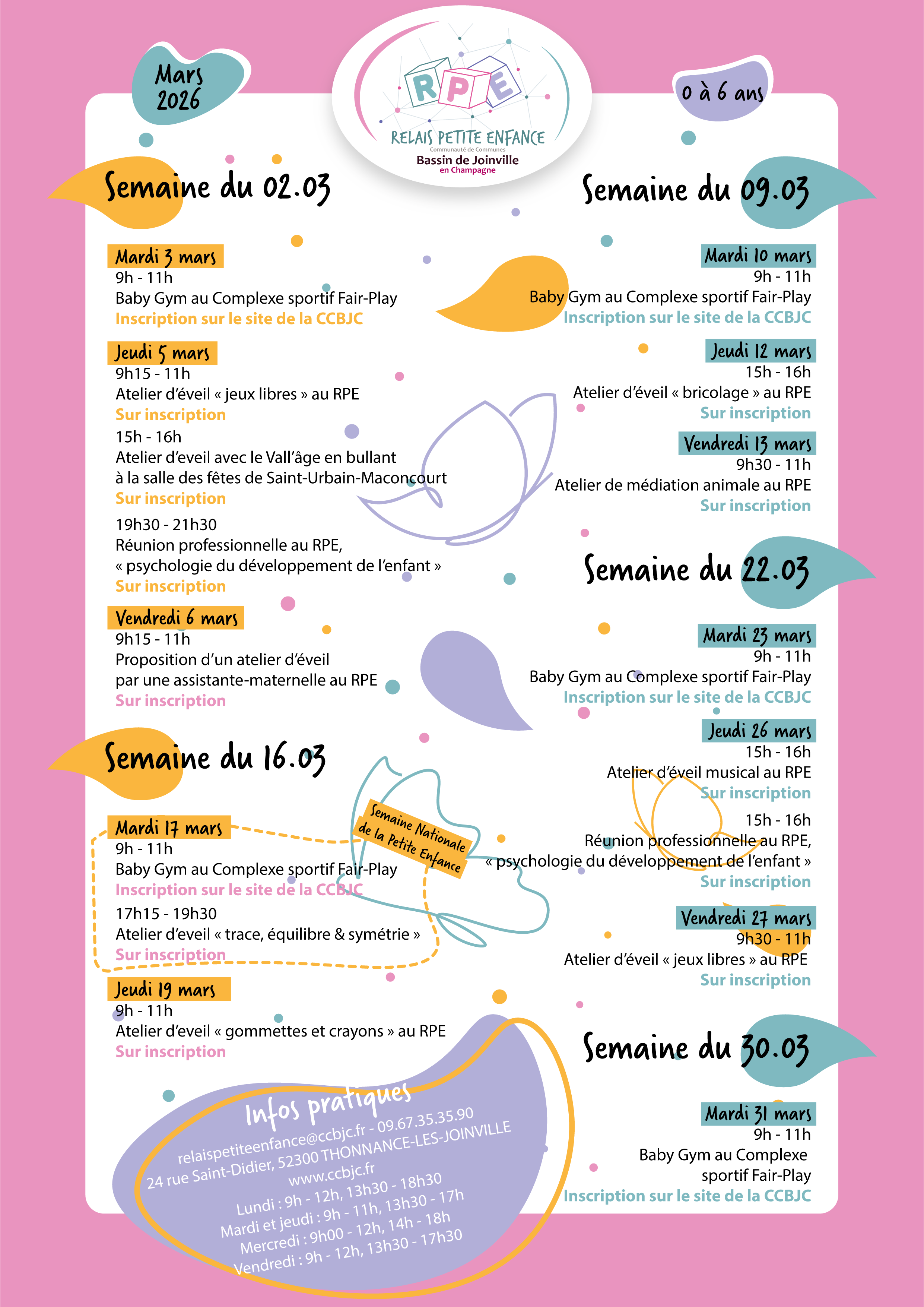 Retrouverez ci-dessous le nouveau planning du relais petite enfance pour le mois de mars 2026. Contact : relaispetiteenfance@ccbjc.fr 09.67.35.35.90